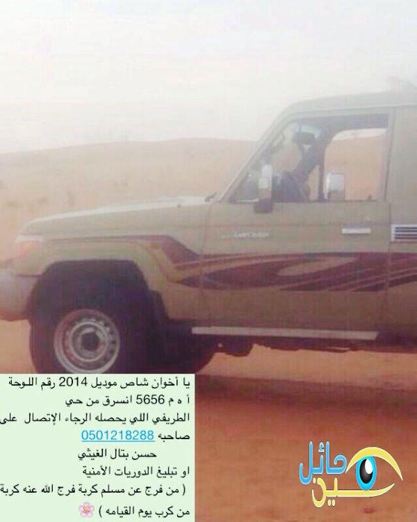 تعرضت سيارة للسرقة من نوع جيب شاص 2014 خليجي اللون بيج اللوحة ( أ هـ م 5656 ) يوم أمس بحي الطريفي ويناشد صاحبها شباب حائل مساعده بالبحث عنها وقد وضع مكافأة ماليه لمن يجدها.