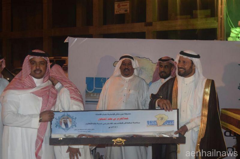 أقامت ” صحيفة عين حائل الإخبارية ” في مقرها الواقع على الدائري الغربي بمدينة حائل بحضور مدير الإشراف التربوي بتعليم حائل الأستاذ / بدر نشاء الرشيدي ورئيس مركز الودي الشيخ / عبدالله بن فرحان السعيد ومدير الشؤون الاجتماعية بمنطقة حائل الأستاذ / خالد بن عيد النويصر ومدير سجن حائل العام العقيد / متعب بن عبدالله الغازي ومدير أسكان حائل سعادة المهندس عبدالمحسن المطير ورجل الأعمال عبدالله الفريدي ورئيس المجلس البلدي الأستاذ / فهد بن سعد العامر وسعادة الأستاذ / عبدالله بن محمد العميم ورجل الأعمال محمد العفري العنزي والشيخ / مهدي التبيناوي ورجل الأعمال خالد مطلق اللحيدان ورئيس شعبة السير بمرور حائل المقدم سعود الرشيدي ورئيس النادي الادبي بمنطقة حائل الدكتور نايف المهيلب وعدد من الضباط و رجال الأعمال والمشايخ والإعلاميين والمشرفين التربويين بتعليم حائل ومعلمي ومدراء المدارس وجمع غفير من الأقارب والأصدقاء وبحضور القناة الفضائية قناة نايلات حفل تكريم لأقدم مدير مدرسة بمنطقة حائل الأستاذ / عبدالعزيز بن فهد المشهور وذلك بمناسبة تقاعده من التعليم بعد 40 عام قضاها في تنوير وتعليم أبنائه الطلاب دون كلل أو ملل .