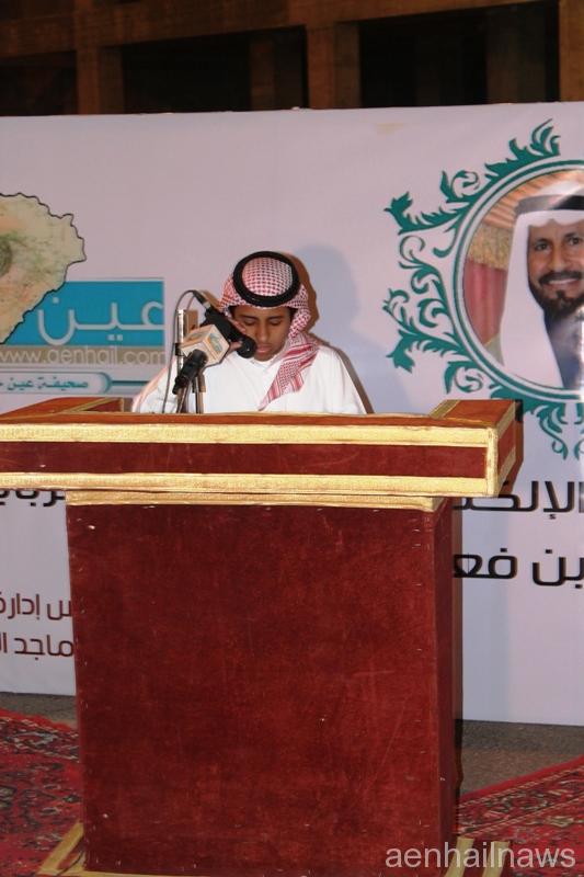 وقد بدء الحفل بآيات من الذكر الحكيم قدمه القارئ نواف بن ماجد المسمار . ثم كلمة الصحيفة قدما رئيس تحرير الصحيفة ونائب رئيس مجلس الإدارة الأستاذ منيف بن مرعي الفرحان والتي قال فيها … إن هذا المساء لا يليق به إلا أن نقول عنه أنه لمن دواعي السرور والشرف أن نكونَ معكم و بينكم وراعيا لهذا الحفل . والذي تُحْييه صحيفتنا ” صحيفة عين حائل الإخبارية ” احتفاءً بالأستاذ الكريمِ ” عبدالعزيز بن فهد المشهور ” الذي أنهى خدمته بعد مسِيرةٍ الــ ( 40 عاما ) والتي كانت حافِلَةٍ بالعطاء في ميدان الشرف، ميدان التربيةِ و التعليمِ.