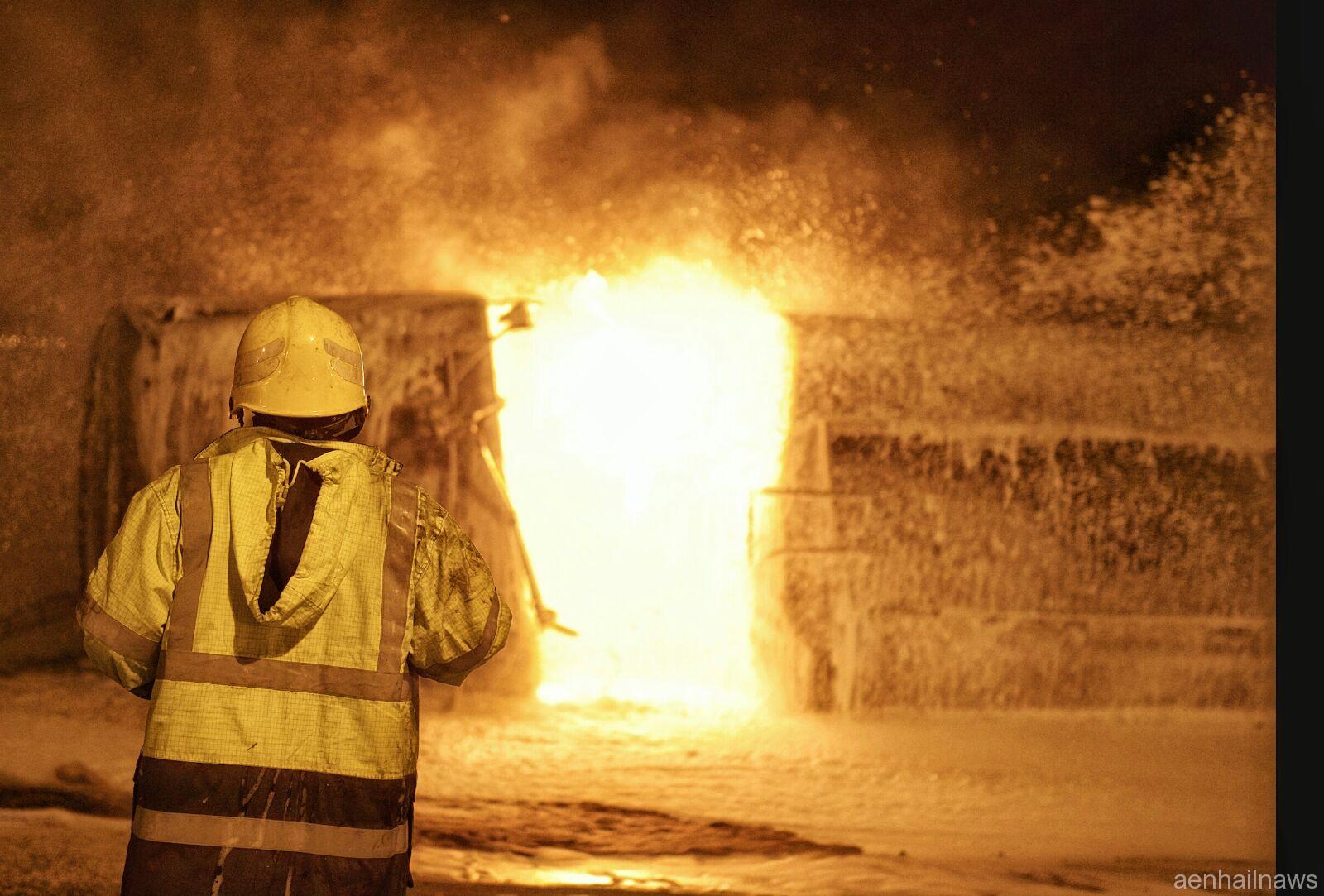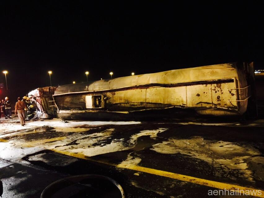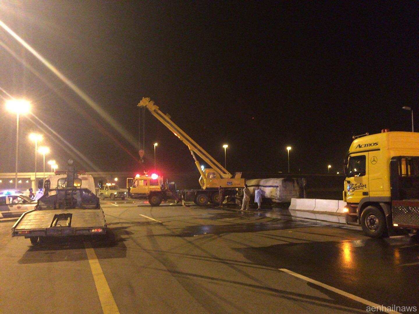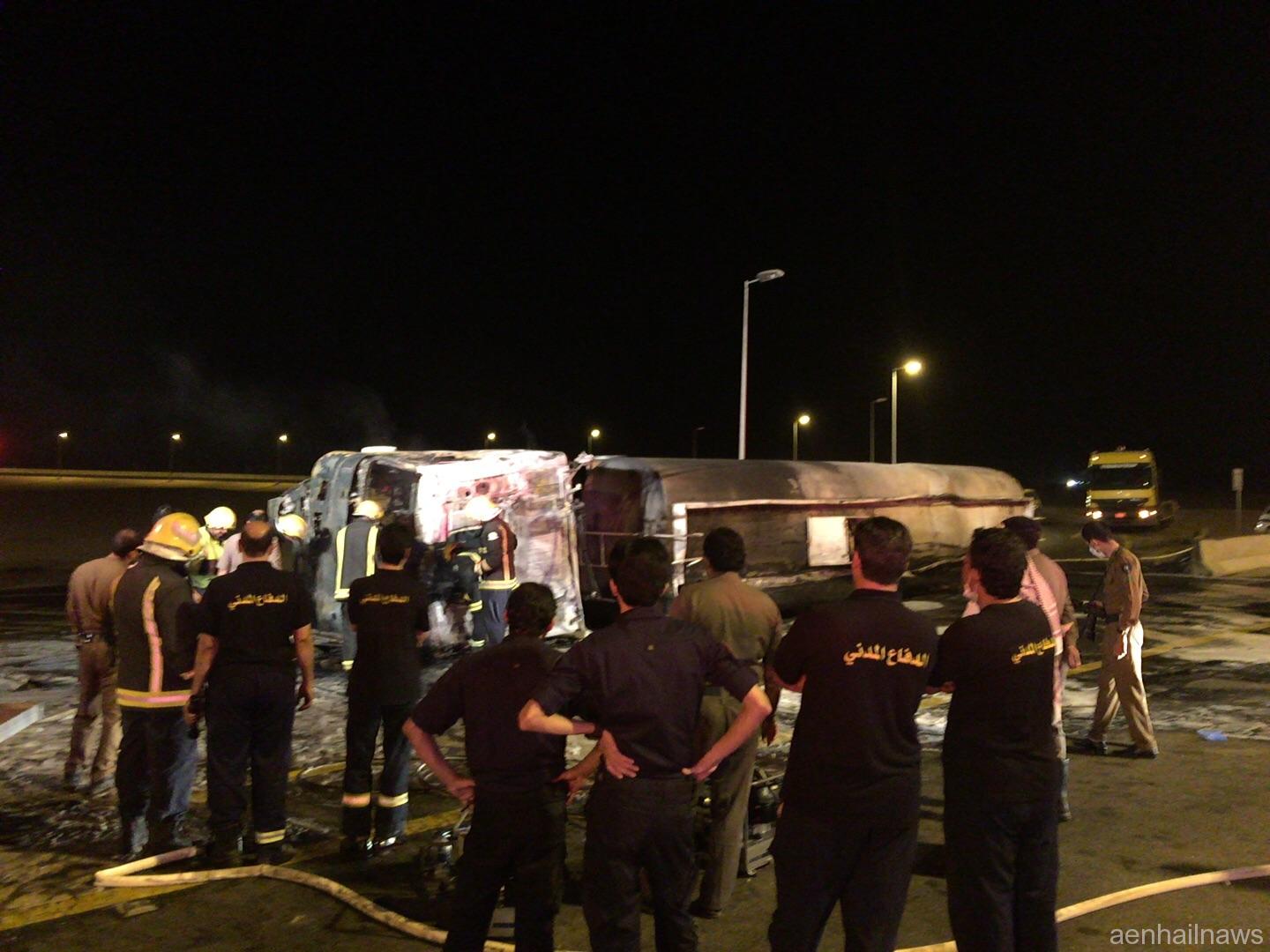 تلقت غرفة التحكم والتوجيه بالإدارة العامة للدفاع المدني بمدينة حائل بلاغا عند الساعة التاسعة من مساء الأربعاء الموافق ٢٤-١٢-١٤٣٦هـ عن انقلاب ناقلة مواد بترولية بالقرب من تقاطع طريق القصيم المدينة المنورة السريع واندلاع النيران فيها .جرى على أثر ذلك انتقال فرق الإطفاء والإنقاذ تساندها ثلاث من صهاريج المياه المزودة بمادة الرغوة من وحدة الاسناد والاحتياط وبالوصول وجد الحادث عبارة عن انقلاب ناقلة مواد بترولية خام على أحد محاور الدوران بطريق المدينة المنورة السريع واندلاع النيران بكبينة المركبة وخزان الناقلة فتمت محاصرة الحريق والسيطرة عليه ونتج عن الحادث وفاة قائد الناقلة حيث جرى إخراج جثمانه واتضح أنه من جنسية آسيوية وسلم الحادث لجهة الاختصاص وقد شاركت الجهات الأمنية والإسعافيه في الحادث .نسأل الله أن يتغمد المتوفى بواسع رحمته وغفرانه .أوضح ذلك لـــ ” صحيفة عين حائل الإخبارية ” المتحدث الرسمي للدفاع المدني بمنطقة حائل الرائد/ نافع بن عليان الحربي