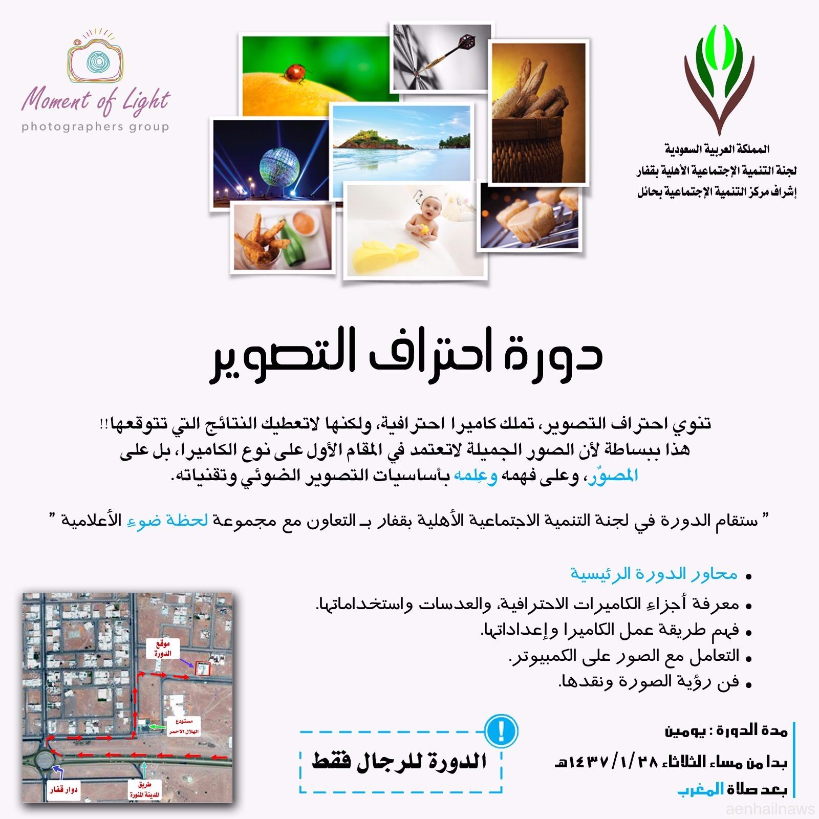 تعتزم لجنة التنمية الاجتماعية الأهلية بقفار أقامه دوره في التصوير الاحترافي لمده يومين أعتبارا من يوم الثلاثاء 1/28 في مقر اللجنه بالتعاون مع مجموعة لحظه ضوء الإعلامية أوضح ذلك لـــ ” صحيفة عين حائل الإخبارية ” الأستاذ غازي طارب سعيد الشمري رئيس لجنة التنمية الاجتماعية الأهلية بقفار