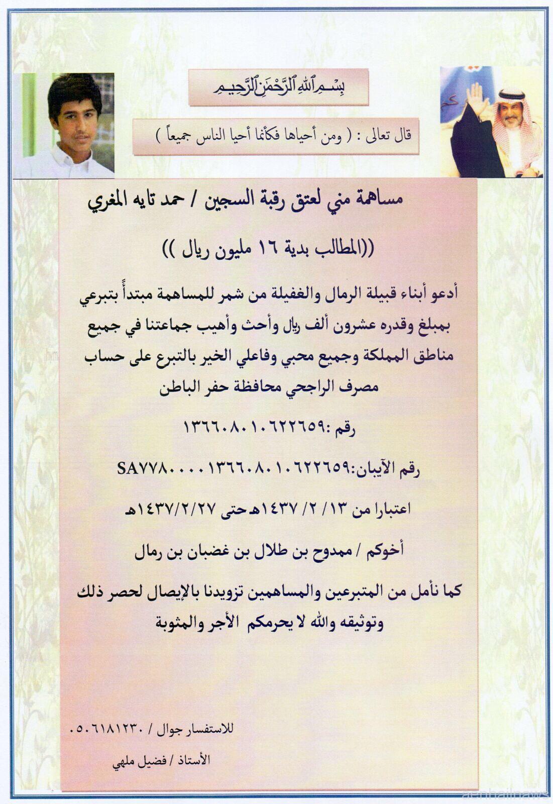 ((المطالب بدية ١٦مليون ريال))أدعو أبناء قبيلة الرمال والغفيلة من شمر للمساهمة مبتدأً بتبرعي بمبلغ وقدره عشرون الف ريال وأحث وأهيب جماعتنا في جميع مناطق المملكة وجميع محبي وفاعلي الخير بالتبرع حساب مصرف الراجحي محافظة حفر الباطن رقم:١٣٦٦٠٨٠١٠٦٢٢٦٥٩