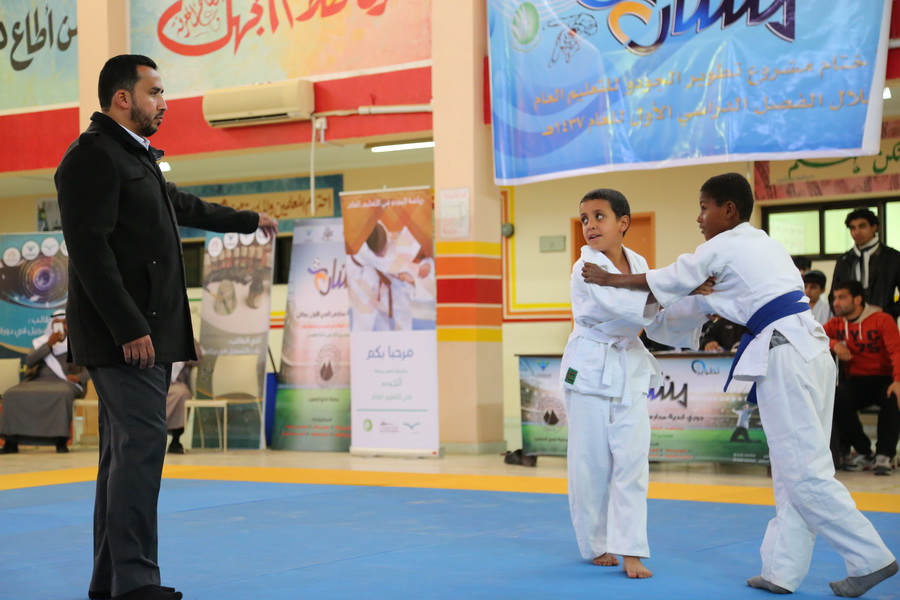 بحضور مدير الناشط التربوي في إدارة تعليم منطقة حائل وممثل أندية مدارس الحي لمنطقة حائل الأستاذ محمد بن تركي العنزي وسفير الاستراتيجية المشرف التربوي محمد بن يوسف السعيد ورئيس نادي قفار الرياضي فهد السمران ( الراعي الرسمي لبطولة مشروع تطوير تطوير الجودو في التعليم العام ) للفصل الدراسي الأول من عام 36-1437 هـ .أقيم يوم أمس الأثنين 10-3-1437 هـ في نادي حي مشار ختام بطولة مشروع تطوير الجودو للمراحل الثلاثة ( الابتدائية – المتوسطة والثانوية ) تحت إشراف مشرف منطقة حائل للجودو الكابتن عادل القرملة وعدد من المدربين والحكام لرياضة الجودو وهم كالتالي : 1- الحكم الدولي محمد القرمله 2- المدرب محمد كساب 3- الحكم تركي منير 4- الحكم فهد الدبيكل 5- المدرب احمد شعبان 6- المدرب عيسى عبيد 7- المدرب كريم اسماعيل 8- المدرب محمد صالح الخياط . حضر هذه البطولة العديد من اللاعبين المشاركين والزوار . تنافس الجميع على نيل الميداليات الذهبية وحصد المراكز الأولى . وفي نهاية البطولة كرّم كلاً من مدير النشاط محمد التركي والمشرف محمد السعيد ومدير نادي حي مشار عبدالعزيز السويلم الفائزين في المسابقة ، وتم تكريم الراعي الرسمي للبطولة الأستاذ فهد السمران رئيس نادي قفار الرياضي لرعايته ودعمه لرياضة الجودو واحتواء الشباب ، من جانب أخر كرم-مشرف المنطقة للجودو الكابتن عادل القرملة كلاً من محمد التركي ومحمد السعيد بدروع تذكارية على حضورهم وتشريفهم لهذه البطولة