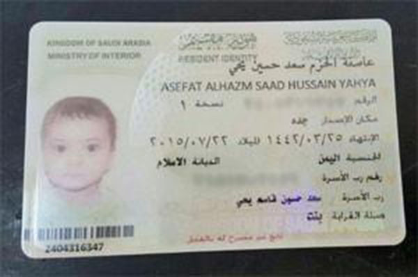 وتناقلت مواقع التواصل الاجتماعي، صورة لـ”هوية مقيم” الخاصة بالطفلة صادرة من جدة، وتحمل اسم “عاصفة الحزم سعد حسين يحيى”، وقد عبر عدد من المعلقين على الصورة، عن أملهم في أن يعم الأمن والاستقرار ربوع اليمن الشقيق.
