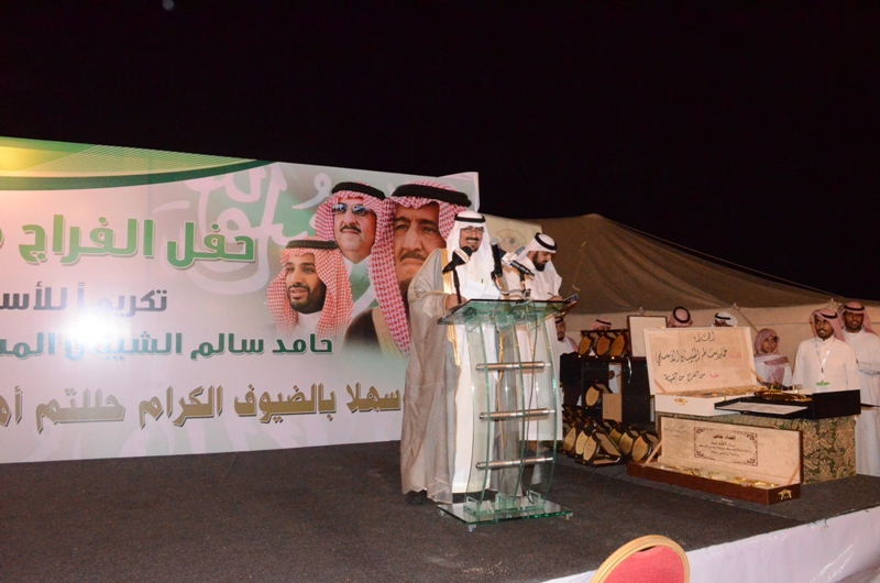 وقد بدء الحفل بآيات من الذكر الحكيم بعدها قدم فقرات الحفل الأستاذ غازي بن طارب الشمري والتي اشتملت على عدد من الكلمات الترحيبية والقصائد الشعرية بهذه المناسبة وفي ختام فقرات الحفل قدمت الهدايا للأستاذ حامد بن سالم الشيبان المسعودي الأسلمي من الحضور جزء صنيعه البطولي وتم تكريم المشاركين بالحفل حيث كرمت” صحيفة عين حائل الإخبارية ” الراعي الالكتروني للحفل وبعد ذلك تناول الجميع طعام العشاء العد لتلك المناسبة