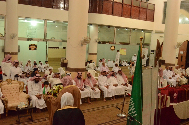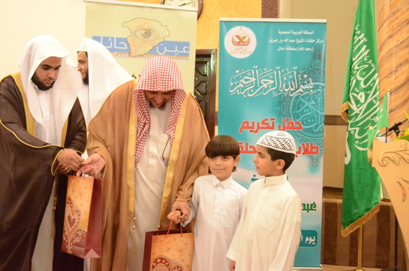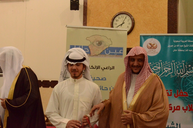 أقامت مساء اليوم الأحد الموافق 24_7_1437هـــ إدارة مركز حلقات الشيخ / عبدالله بن جبرين ( رحمه الله ) بجامع الشيخة نوف بعد صلاة المغرب في حي الزبارة بمدينة حائل بحضور فضيلة الشيخ حمد الحمد حفلها الختامي للعام 1437هـــ برعاية إعلامية من” صحيفة عين حائل الإخبارية ” حيث بدء الحفل بآيات عطره من الذكر الحكيم تلاها أحد الطلبة ثم كلمة الطلاب وبعده كلمة أولياء الأمور ومن ثم كلمة للمشرف التعليمي بعد ذلك قدم مدير المركز الشيخ / عبدالله بن محمد العنزي كلمة رحب فيها بالحضور وشكر خلالها الداعمين للمركز وحث الطلاب على الاستمرار في الارتباط بكتاب الله مقدما شكره لأولياء أمورهم وذلك على حرصهم على التحاق أبناءهم بحلقات القران وحفظه .