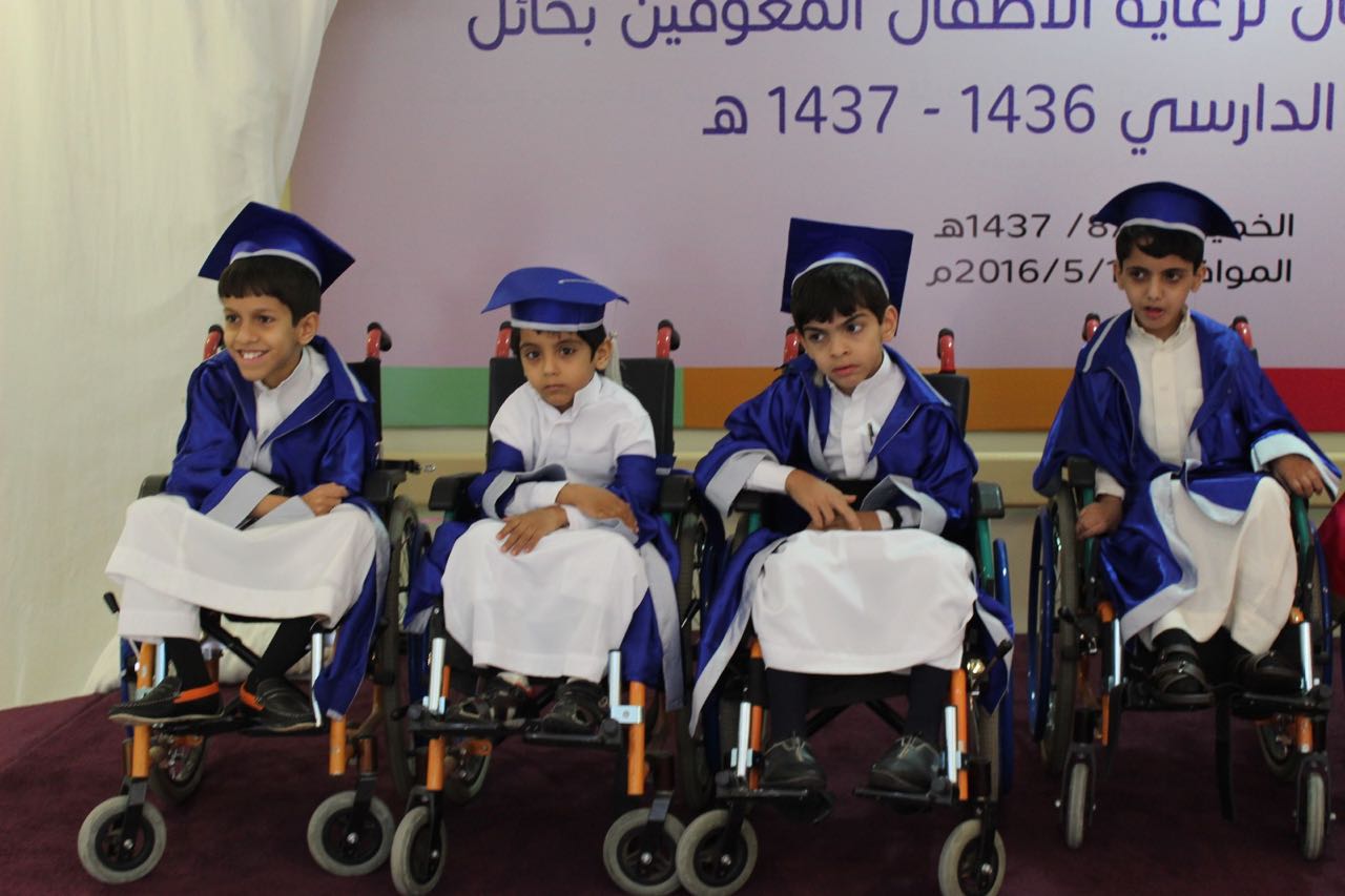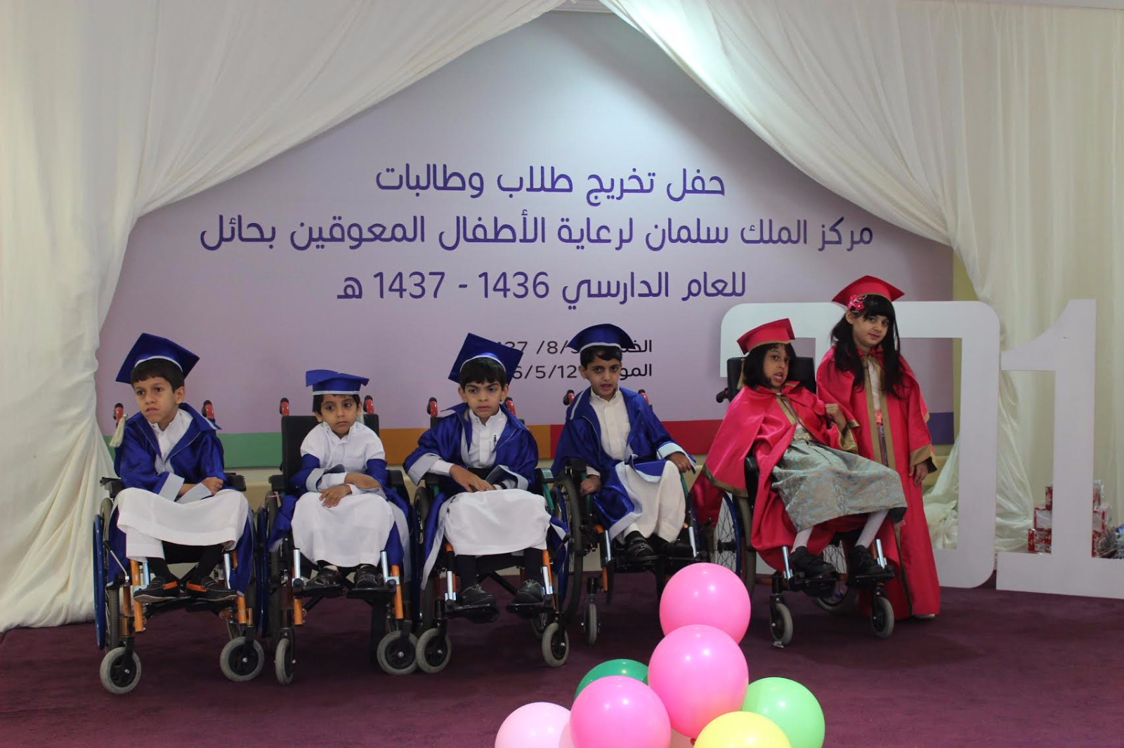 نظم مركز الملك سلمان لرعاية الأطفال المعوقين بمنطقة حائل حفل التخرج لأطفال المركز نهاية العام الدراسي لعام 1437هـ والبالغ عددهم 10 أطفال، وذلك بحضور المشرفة العامة على كليات البنات بجامعة حائل د. حنان بنت سالم آل عامر ووكيلة كلية العلوم للبنات بجامعة حائل د. شيرين الشومر وعدد من عضوات الجمعية العمومية بالمركز وأمهات الأطفال والعديد من الضيوف.