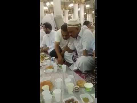 وظهر في الفيديو مجموعة من المصلين بالحرم المدني جالسين على سفرة الإفطار، وكان بينهم رجل بلا يدين، وتطوع شاب يجلس بجانبه وقام بإطعامه.