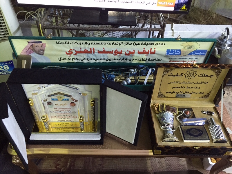 في ليله تعطرت جنباتها بأسمى معانى الوفاء وفى جو بهيج من الألفة والمحبة إحتفلت أسرة ” صحيفة عين حائل الإخبارية ” مساء يوم الاربعاء الموافق 22_ 10 _ 1437هـــ بمقرها الواقع على الدائري الغربي بمدينة حائل بالزميل الإعلامي الأستاذ نايف بن يوسف العنزي بمناسبة تقاعده من عمله في إدارة صندوق التنمية الزراعية بمدينة حائل وذلك بحضور مدير عام فرع صندوق التنمية الزراعية بمنطقة حائل الأستاذ سطم بن غانم عواد الشمري ومساعد مدير عام فرع صندوق التنمية الزراعية بمنطقة حائل المهندس صالح محمد الأحمد وحضور عدد من رجال الاعمال والإعلاميين ومحبي اليوسف حيث قدم خلال الاحتفال الأستاذ والإعلامي والشاعر إبراهيم الجلعود عدد من القصائد بهذه المناسبة وتم تقديم الهدايا والدروع للأستاذ نايف اليوسف بمناسبة تقاعده وتناول الجميع طعام العشاء .