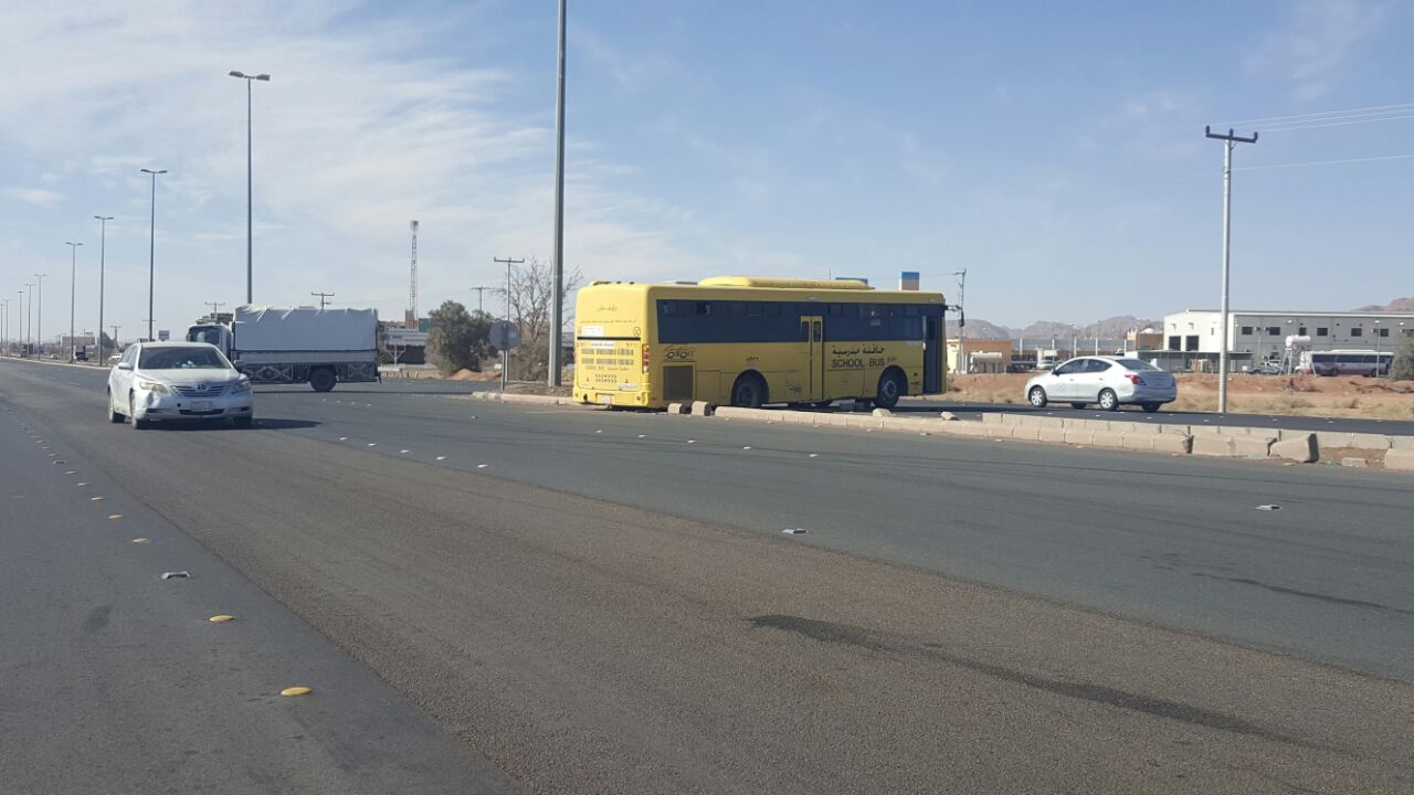 تجشم باص مدرسي رصيف على طريق المدينة المنورة جنوب مدينة حائل بالقرب من الودي حيث تسبب ذلك في تعرض الباص للتعلق بين بلك الرصيف الذي تسبب بتوقفه بالجزيرة الوسطية فحاول اكثر من مره حتى خرج بعدما قش عدد من بلك الرصيف