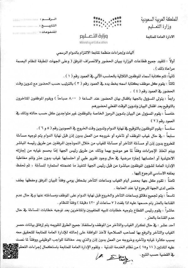 وعن تكرار التأخير والغياب، أوضح التعميم، أنه يحق للجهة رفع ببيانات حصر الغياب والتأخير إلى صاحب الصلاحية وأخذ الموافقة على إحالة الموظف إلى الإدارة العامة للمتابعة للتحقيق معه وفيما يلي نص تعميم إلغاء البصمة، والإلحاق به المُوقّع من قبل وزير التعليم الدكتور أحمد العيسى: