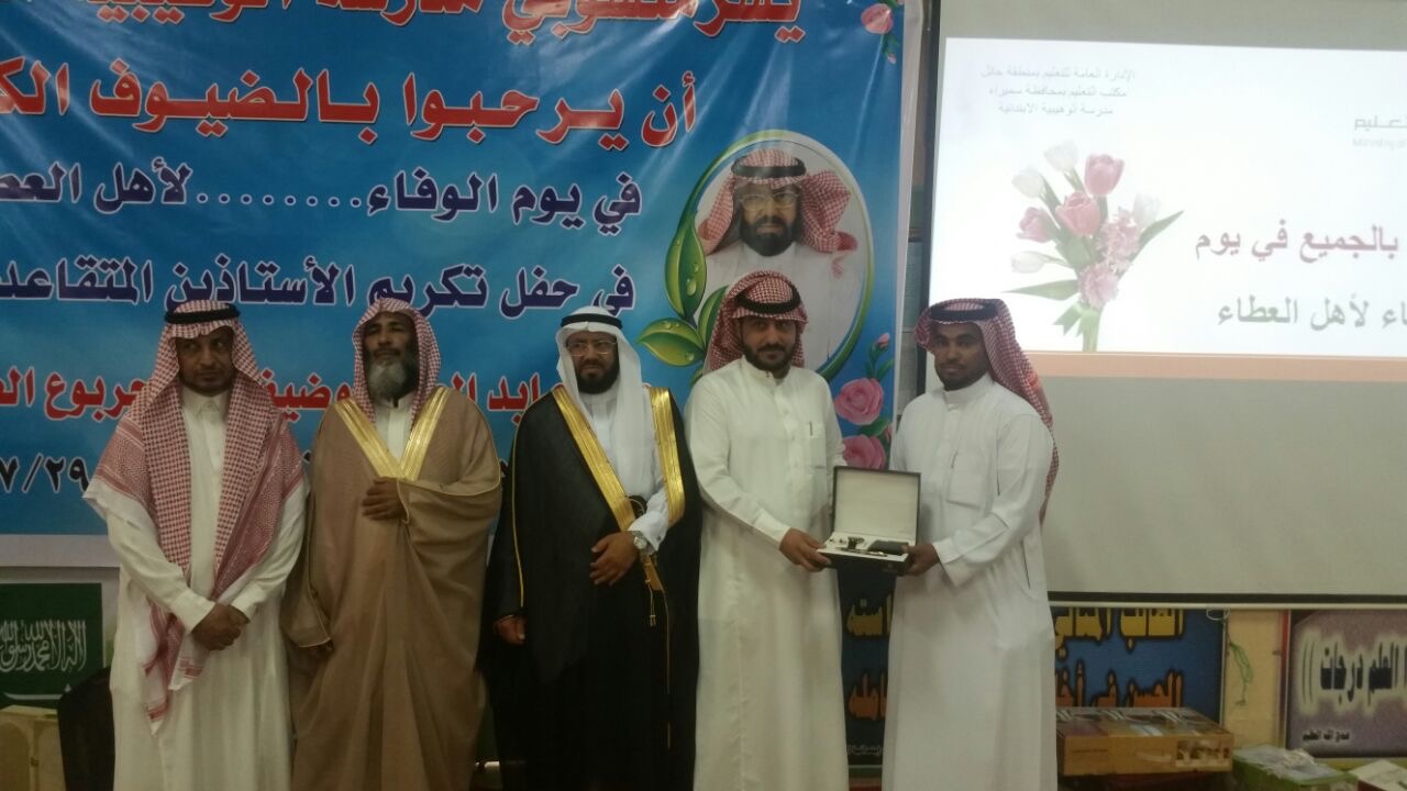 بحضور مدير مكتب التعليم بمحافظة سميراء الاستاذ عبدالله محمد الشبرمي ومدير مكتب التعليم بمدينة الروضة الاستاذ مساعد فضي البراك ورئيس مركز امارة وسيطاء الحفن الاستاذ عبدالله محمد اللحيدان وعدد من قادة المدارس ومدير مركز صحي الوهيبية عبدالعزيز مشعان ومدير مكتب الخدمات البلديه بالوهيبيه وعدد من أعيان القريه وأولياء الأمور أقامت ابتدائية الوهيبية للبنين حفل تكريم للأساتذة ضيف الله جربوع العنزي و عمير عايد العنزي بمناسبة تقاعدهم .
