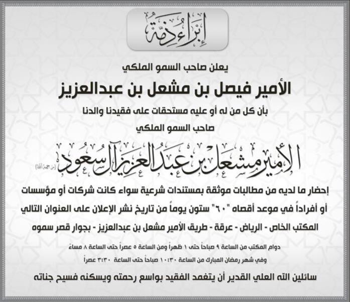 نشر الأمير فيصل بن مشعل بن عبدالعزيز بيان “إبراء ذمة” لوالده الراحل رئيس هيئة البيعة، الذي توفي في 3 مايو الجاري، في عدد من الصحف.ودعا الأمير فيصل بن مشعل كل من له أو عليه مستحقات على الفقيد الأمير مشعل بن عبدالعزيز أن يقوم بإحضار ما لديه من مطالبات موثقة بمستندات شرعية، سواء كانوا شركات أو مؤسسات أو أفرادا.