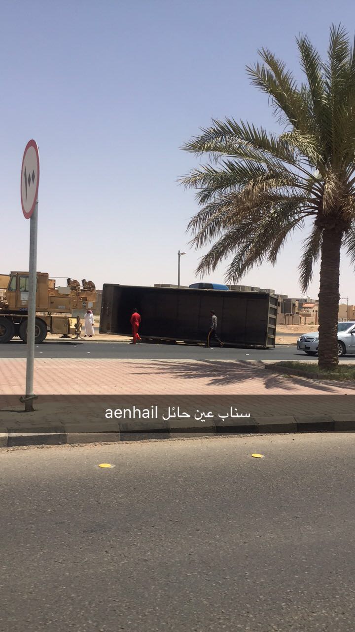 تعرضت تريلة لحادث انقلاب على طريق الملك سلمان بمدينة حائل وتم مباشرة الحادث من الجهات المختصة