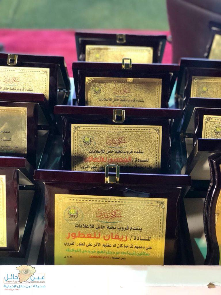كما تمّ تكريم امانة منطقة حائل ومدير المركز الإعلامي سعد الثويني وجميع الداعمين طوال أيام المهرجان لقروب نخبة حائل للإعلانات وتم فيها تقديم مسابقات والسحب على الجوائز وإعلان الفائزين ..