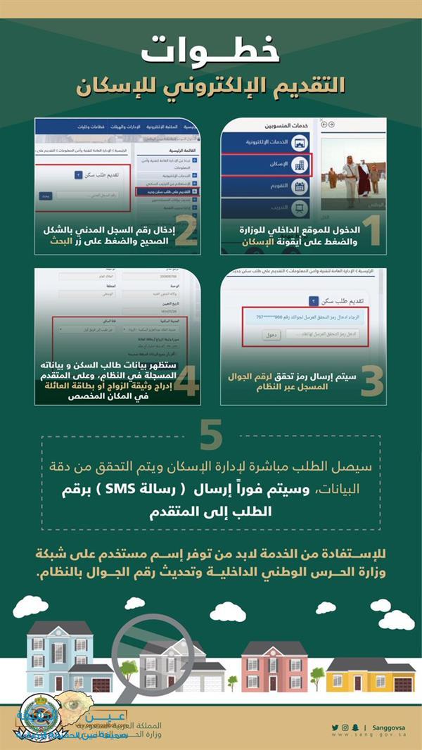وبيَّنت أن أولى الخطوات للتقديم الإلكتروني هي الدخول على الموقع الداخلي، والضغط على أيقونة الإسكان، ومن ثم تعبئة البيانات المطلوبة، حيث سيصل الطلب مباشرةً لوزارة الإسكان، والتحقق من دقة البيانات، وإشعار المستفيد بتسلم طلبه.