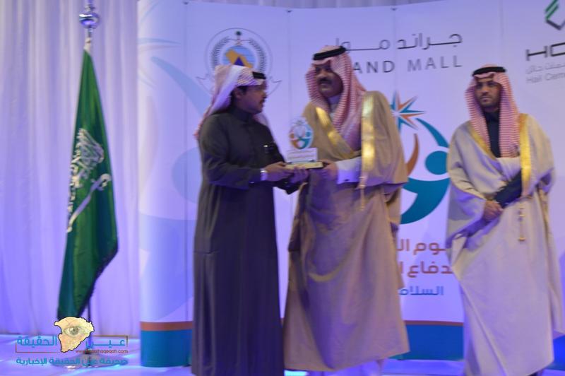 “السلامة أولا “. وتدشين المعرض المصاحب, بمجمع قراند مول بمدينة حائل وكان التكريم بحضور صاحب السمو الملكي الأمير فيصل بن فهد بن مقرن بن عبدالعزيز نائب أمير منطقة حائل و مدير المديرية العامة لدفاع المدني بمنطقة حائل العميد عبدالله بن عثمان الركيان وعدد من مدراء الدوائر الحكومية وقد استلم التكريم رئيس مجلس إدارة صحيفة عين الحقيقة الأستاذ ماجد المسمار