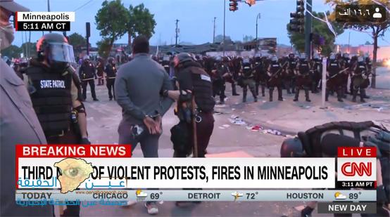 احتجزت الشرطة الأمريكية في ولاية مينيسوتا مراسل شبكة CNN، عمر جيمينيز، أثناء بث مباشر في موقع الاحتجاجات في منيابوليس.وقالت القناة الاخبارية الاميركية ان الاعتقال جاء بعد أن عرف المراسل عن نفسه بوضوح للضباط.واضافت : كما تم احتجاز الطاقم الذي كان برفقة جيمينيز، بما في ذلك المنتج والمصور. واندلعت الاحتجاجات في منيابوليس إثر وفاة المواطن الأمريكي الأسود جورج فلويد، الذي ظهر في فيديو وهو يجاهد لالتقاط أنفاسه بينما يضغط ضابط شرطة أبيض بركبته فوق عنقه.