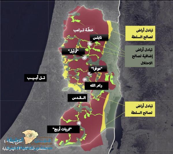 ووفق هذه الخريطة، فقد منحت إسرائيل “تعويضاً” للفلسطينيين (المناطق باللون البرتقالي) وهي الأراضي التي استعدت للتخلي عن السيادة فيها.وأكدت القناة، أن الفرق الرئيسي بين هذه الخريطة والخريطة الأمريكية الأصلية، هو أن الجيوب والمستوطنات المعزولة لم تعد “بالون مربوط في خيط” (أي معزولة عن الكتل الاستيطانية) بل أصبحت قطاعات أوسع بكثير تشمل أيضاً حوالي 20 بؤرة استيطانية ونقاط استيطانية لم تظهر في الخريطة الأولية.وكانت الإدارة الأمريكية، قد نشرت خريطة أوضحت فيها، كيف ستبدو حدود فلسطين وإسرائيل، بناءً على خطة السلام المعروفة إعلامياً (صفقة القرن).
