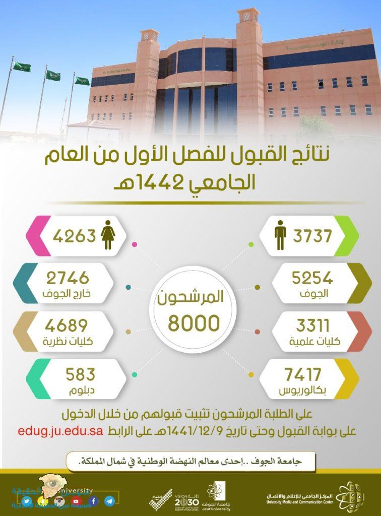 أعلنت جامعة الجوف نتائج القبول للفصل الدراسي الأول من العام الجامعي 1442هـ، لمرحلة البكالوريوس والدبلوم، وحددت يوم الخميس الموافق 1441/12/9هـ موعداً لتثبيت القبول من خلال بوابة القبول الإلكترونية عبر الرابط التالي: https://edug.ju.edu.sa/ju/init.
