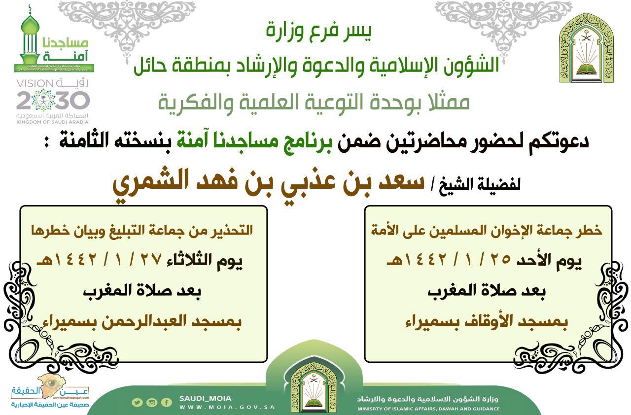 ينظم فرع وزارة الشؤون الإسلامية والدعوة والإرشاد بمنطقة حائل ممثلاً بوحدة التوعية العلمية و الفكرية إقامة محاضرتين ضمن برنامج مساجدنا آمنة ( بنسختة الثامنة ) الأولى بعنوان خطر جماعة الإخوان المسلمين على الأمة والتي تقام يوم الأحد الموافق 25 / 1 / 1442 هـ بمسجد الأوقاف بسميراء والأخرى بعنوان التحذير من جماعة التبليغ وبيان خطرها والتي تقام يوم الثلاثاء الموافق 27 / 1 / 1442 هـ بمسجد العبدالرحمن بسميراء ويلقي تلك المحاضرات فضيلة الشيخ / سعد بن عذبي بن فهد الشمري .