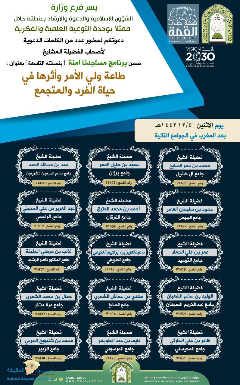 فرع الشؤون الإسلامية والدعوة والإرشاد بمنطقة حائل ممثلاً بوحدة التوعية الفكرية والعلمية وضمن برنامج مساجدنا آمنة ( بنسخته التاسعة ) تطلق 15 كلمة لغرس اللحمة الوطنية مواكبة لليوم الوطني الـ90 في جوامع ومساجد المنطقة هذا اليوم الأثنين بعنوان ( طاعة ولي الأمر وأثرها على حياة الفرد والمجتمع ) ،وتهدف الكلمات إلى ترسيخ قيم اللحمة الوطنية والانتماء وتعزيز المواطنة الصالحة في المجتمع، وبيان مكانة المملكة وجهود قادتها في خدمة الإسلام والعناية بالحرمين الشريفين وقاصديهما، والتي يقدمها نخبة من الدعاة الرسميين بفرع الوزارة بالمنطقة.