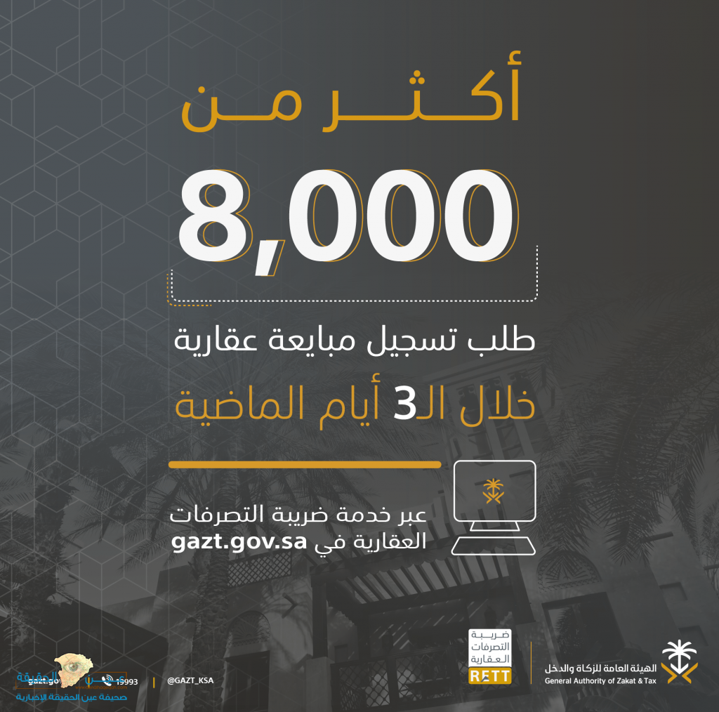أوضحت الهيئة العامة للزكاة والدخل أن عدد طلبات تسجيل المبايعات العقارية في خدمة ضريبة التصرفات العقارية، التي تم إطلاقها مؤخراً بالتزامن مع فَرض ضريبة التصرفات العقارية، بلغ مستوى قياسياً في أيام قليلة تجاوز 8,286 طلبا على مستوى مناطق ومدن المملكة.