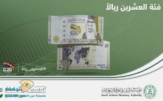 وأشارت “النقد” إلى أن “تصميم ورقة فئة العشرين ريالاً تضمّن صورة خادم الحرمين الشريفين الملك سلمان بن عبد العزيز آل سعود على وجه هذه الفئة، وشعار رئاسة المملكة لمجموعة العشرين (G20) بشكل ثلاثي الأبعاد، فيما تضمّن ظهر الورقة خريطة العالم موضح عليها دول مجموعة العشرين بلون مختلف، وتظهر خريطة المملكة يصدر منها إشعاع يرمز إلى ملتقى هذه الدول على أرضها، وإلى أهمية المملكة باعتبارها مصدر إشعاع حضاري واقتصادي”.