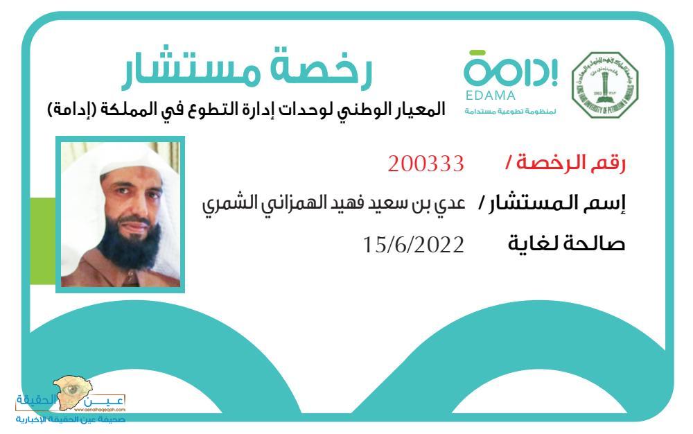 حصل الناشط الاجتماعي والتطوعي الاستاذ عدي بن سعيد الهمزاني، عضو مجلس ادارة اللجنة الوطنية لرعاية السجناء والمفرج عنهم وأسرهم بمنطقة حائل “تراحم حايل “على اول رخصة مستشار في تأسيس وحدات التطوع على مستوى منطقة حائل والتي اصدرها مركز التميز المؤسسي بجامعة الملك فهد للبترول والمعادن وفق المعيار الوطني لوحدات إدارة التطوع في المملكة ( إدامة ) للهمزاني.