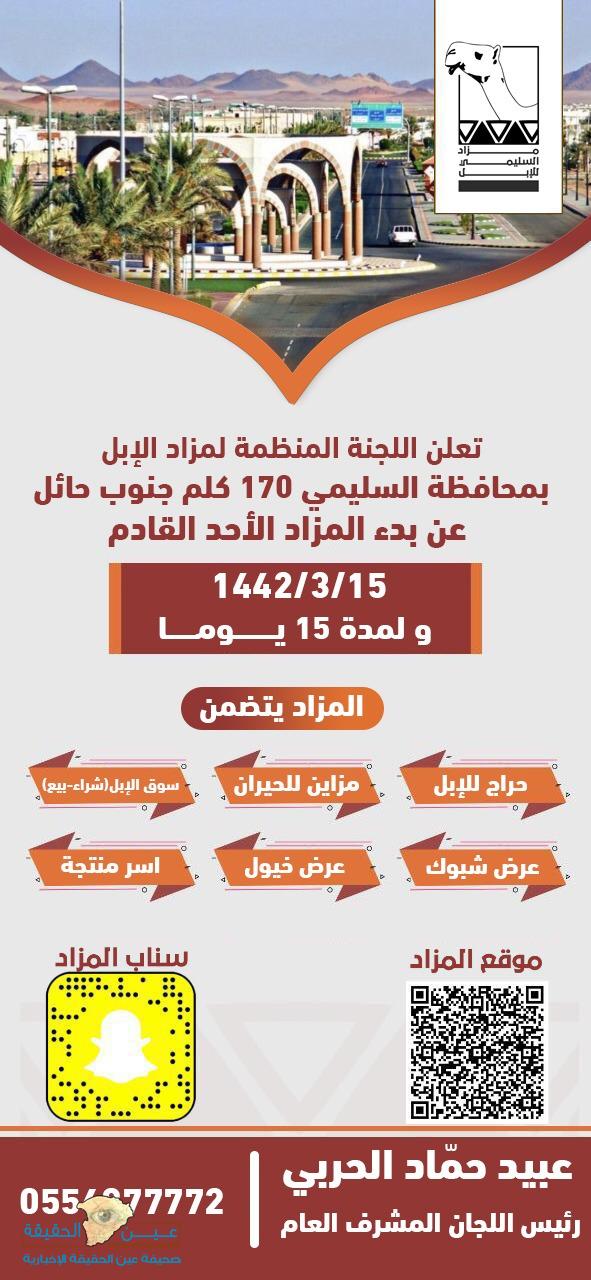 أكملت اللجنة المشرفة على ” مزاد السليمي للإبل” بنسخته الأولى، جميع التجهيزات بموقع المزاد لاستقبال ملاك الإبل والمهتمين بها والأسر المنتجة المشاركة وذلك بمقر المزاد بمحافظة السليمي (170 كلم جنوب حائل).