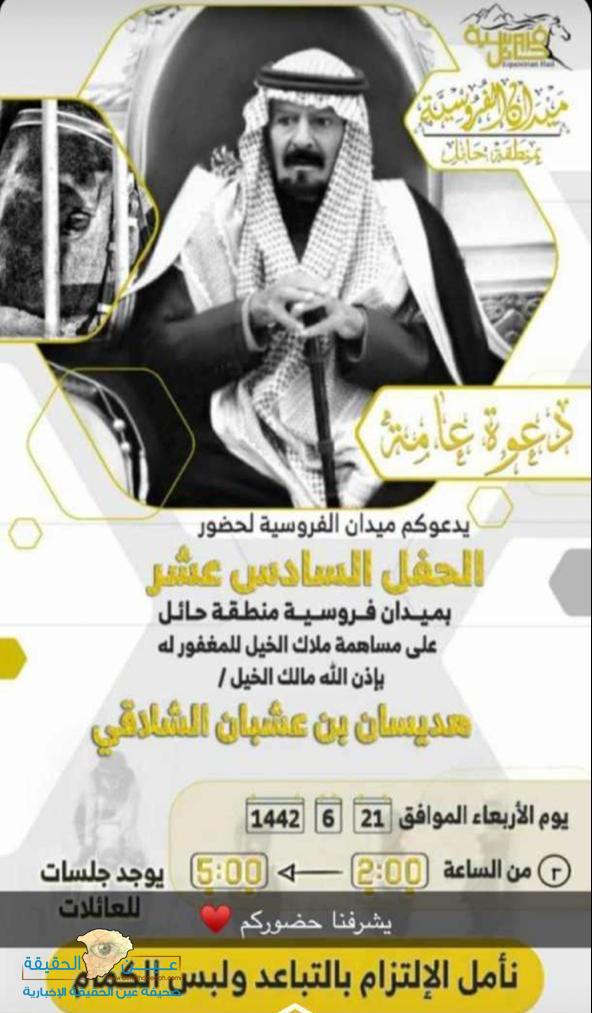 وجه ميدان الفروسية بحائل الدعوة لحضور الحفل السادس عشر بميدان فروسية حائل على مساهمة ملاك الخيل لمالك الخيل هديسان عشبان الشلاقي رحمه الله في بادرة خيرية جميلة يقدمها الملاك لأحد عشاق وملاك الخيل عليه رحمة الله وذلك ، يوم الاربعاء 21 – 6 – 1442 هـ من الساعة الثانية بعد الظهر حتى الخامسة مساءً ..