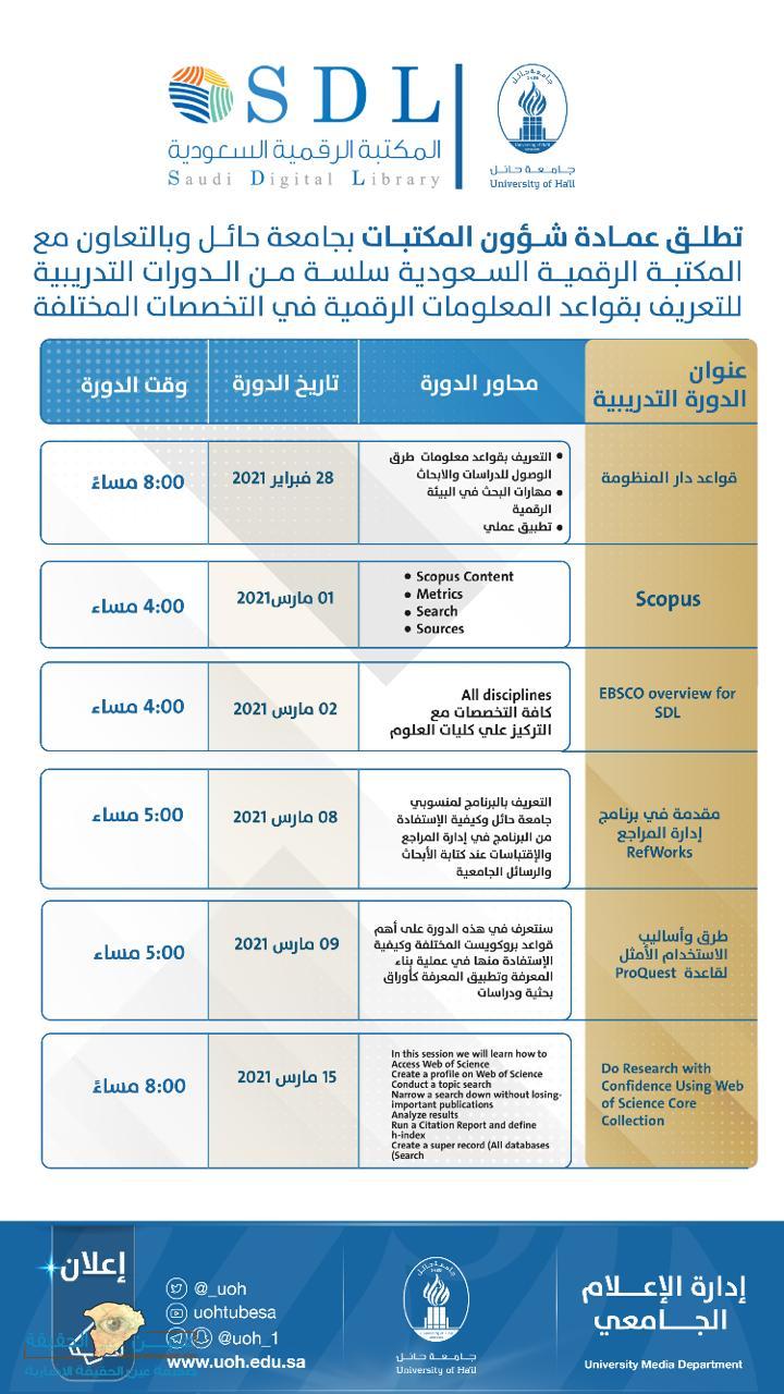 تقدم عمادة شؤون المكتبات بجامعة حائل، بالتعاون مع المكتبة الرقمية السعودية، سلسلة من الدورات التدريبية للتعريف بقواعد المعلومات الرقمية في مختلف التخصصات.