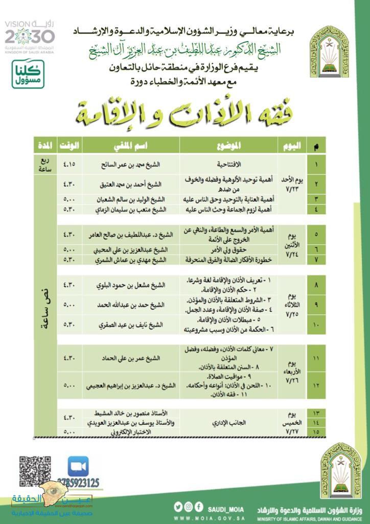 برعاية كريمة من معالي وزير الشؤون الإسلامية الشيخ الدكتور عبداللطيف بن عبدالعزيز آل الشيخ ينظم فرع وزارة الشؤون الإسلامية والدعوة والإرشاد بمنطقة حائل بمنطقة حائل وذلك بالتعاون مع معهد الأئمة والخطباء برنامج ( فقه الأذان والإقامة ) حيث سيتم افتتاحه من قبل فضيلة الشيخ محمد بن عمر السائح مدير عام فرع الوزارة بمنطقة حائل اليوم الأحد الموافق 23/7/1442هـ في تمام الساعة 4:15 مساءً وبعدها تنطلق عدد من الدروس يلقيها عدد من مشايخ دعاة مركز الدعوة والإرشاد بمنطقة حائل ويستمر البرنامج خمسة أيام بمعدل ساعة ونصف وفي نهاية البرنامج يوضح عدد من الأساتذة الجانب الإداري للاختبار الالكتروني .