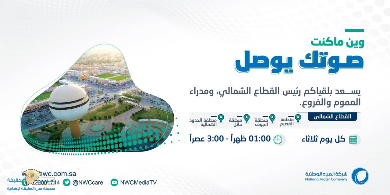 استمراراً لتعزيز ثقافة التواصل مع العملاء توضح المديرية العامة لخدمات المياه بمنطقة حائل استمرار استقبال العملاء من قبل سعادة المدير العام ومدراء الإدارات بمبنى الإدارة الرئيسي الواقع شرق المجمع الحكومي بمدينة حائل وكذلك مدراء الفروع والمكاتب بالمحافظات كل يوم ثلاثاء من الساعة الواحدة ظهراً الى الساعة الثالثة عصراً .