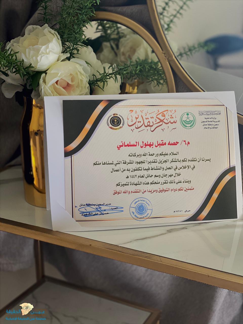 قدم العميد/حسن بن علي الشهري مدير السجون بمنطقة حائل شكره لـ حصة بنت مقبل السلماني المشرفة على جناح السجون الذي اقيم بمهرجان وسم حائل لعام 1442 هـ على جهودها المشرفه وعلى اخلاصها بالعمل التي كلفت به ونشاطها الملموس باي عمل يتم تكلفها فيه.