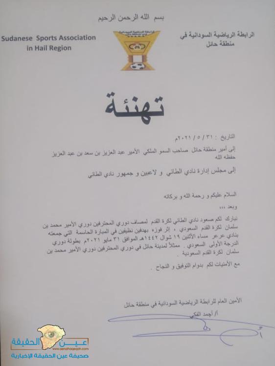 مشاركةً منها فرحة أهالي مدينة حائل بصعود نادي الطائي لكرم القدم لمصاف دوري المحترفين دوري الأمير محمد بن سلمان لكرة القدم السعودي إثر فوزه بهدفين نظيفين في المباراة الحاسمة التي جمعته بنادي عرعر مساء الأثنين 19شوال 1442 الموافق 31 مايو 2021 , بطولة دوري الدرجة الأولى السعودي ، إذ تتقدم الرابطة الرياضية السودانية في منطقة حائل بأحر التهاني و التبريكات إلى صاحب السمو الملكي الأمير عبد العزيز بن سعد بن عبد العزيز ، حفظه الله و إلى مجلس إدارة نادي الطائي و أعضاء و لاعبين و جمهور نادي الطائي بالإنجاز العظيم الذي تحقق بصعود النادي لمصاف دوري المحترفين دوري الأمير محمد بن سلمان لكرة القدم السعودي .. كل التوفيق والنجاح لنادي الطائي ممثل المنطقة في دوري المحترفين السعودي لكرة القدم .