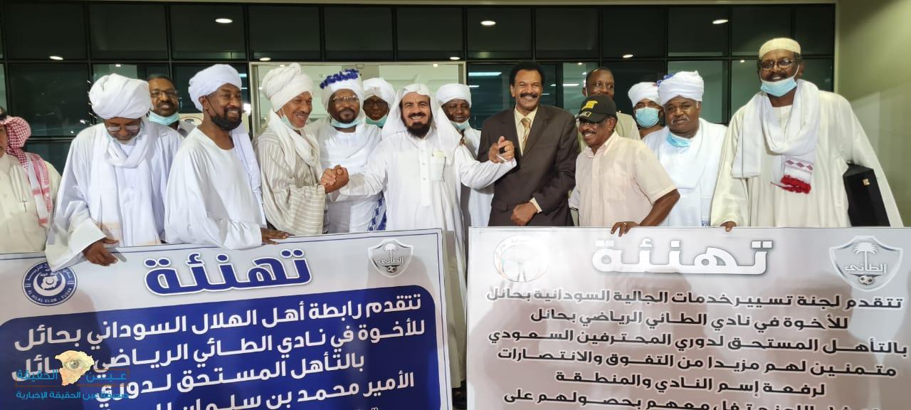 انطلاقا من شعارها المرفوع تواصل اجتماعي مستمر قام وفد من الجالية السودانية بزيارة نادي الطائي للتهنئة وتقديم درع بمناسبة صعود النادي الي دوري الأمير محمد بن سلمان للمحترفين وقد قوبل الوفد بكرم وحفاوة احفاد حاتم الطائي الي احفاد ترهاقا وتفاعل كبير من رئيس النادي الاستاذ تركي الضبعان واعضاء مجلس الإدارة الكرام وتحدث رئيس النادي مثمنآ دور الجالية السودانية في حائل في التفاعل مع أفراح النادي وقدم شكره نيابة عن أهالي حائل وعبر فيها عن شكرة وخالص امتنانة للمبادرة واللفتة الرائعة التي قامت بها الجالية السودانية واحتفالهم معهم بتأهلهم بالصعود وتحدث كذلك عن العلاقة الازلية مابين الشعبين السعودي والسوداني ومايكنونة هم كسعودين من حب واحترام وتقدير للشعب السوداني