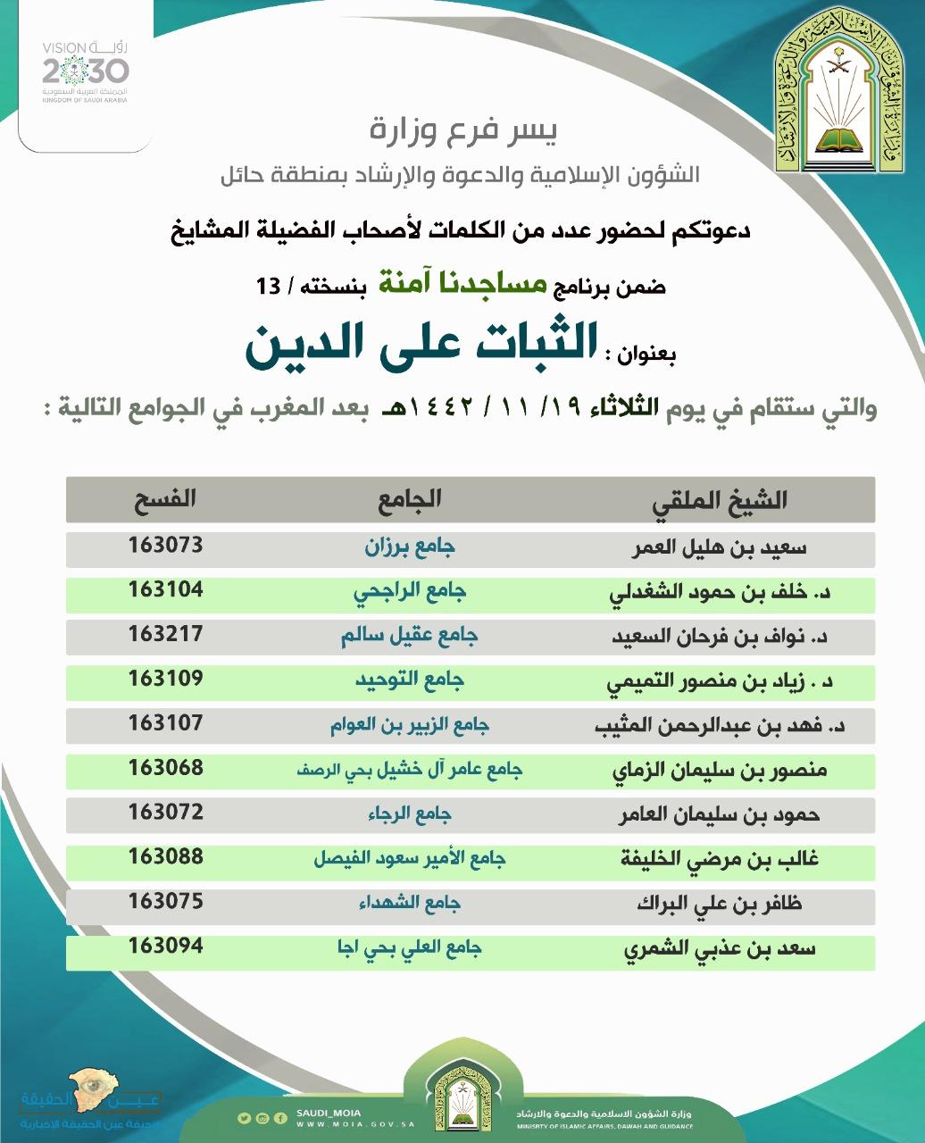 يقيم فرع وزارة الشؤون الإسلامية والدعوة والإرشاد بمنطقة حائل عدد من الكلمات لأصحاب الفضيلة المشائخ ضمن برنامج (مساجدنا آمنة ) بنسخته (13) بعنوان ( الثبات على الدين ) والتي ستقام في يوم الثلاثاء الموافق 19/11/1442هـ بعد صلاة المغرب في عدد من الجوامع.