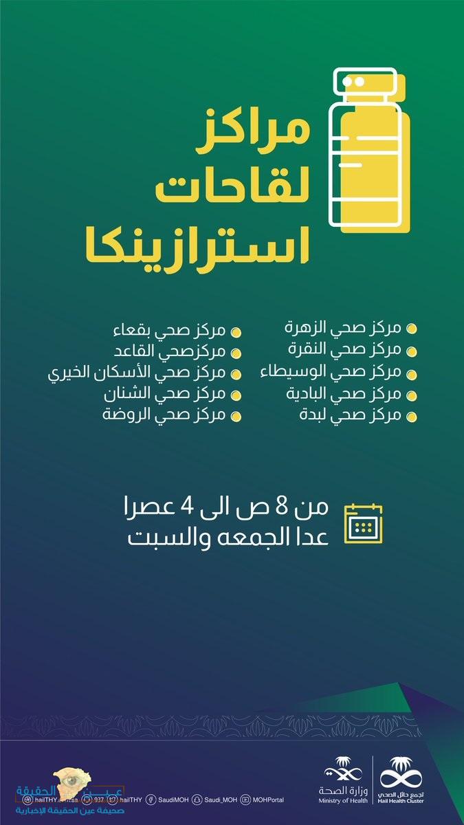 إعلن التجمع الصحي بحائل خلال حسابة بتويتر عن المراكز الصحية التي تستقبل المستفيدين لأخذ لقاح كوفيد 19 .