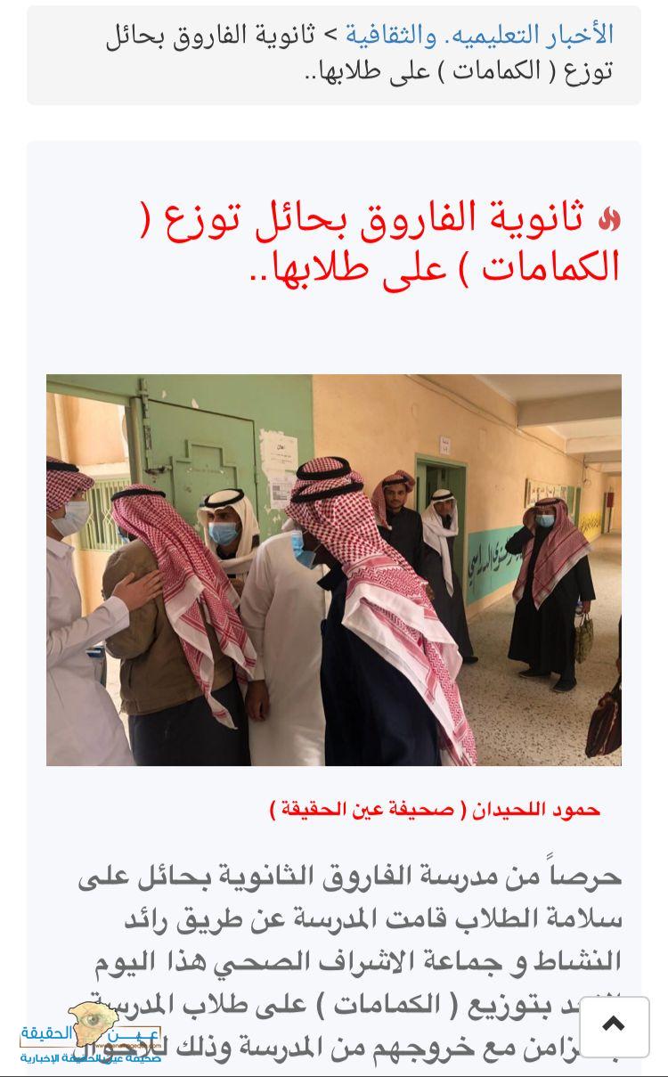 تُعد مدرسة الفاروق الثانوية بحائل أول مدرسة في السعودية تطبق الاحترازات الصحية حين قامت بتوفير الكمامات للطلاب وتوزيعها عليهم في تاريخ 24 – 3 – 2019 والذي انتشرت الكورونا بعد هذا التاريخ بسنة كاملة حيث تم تعليق الدراسة في جميع المدارس بسبب المرض في تاريخ