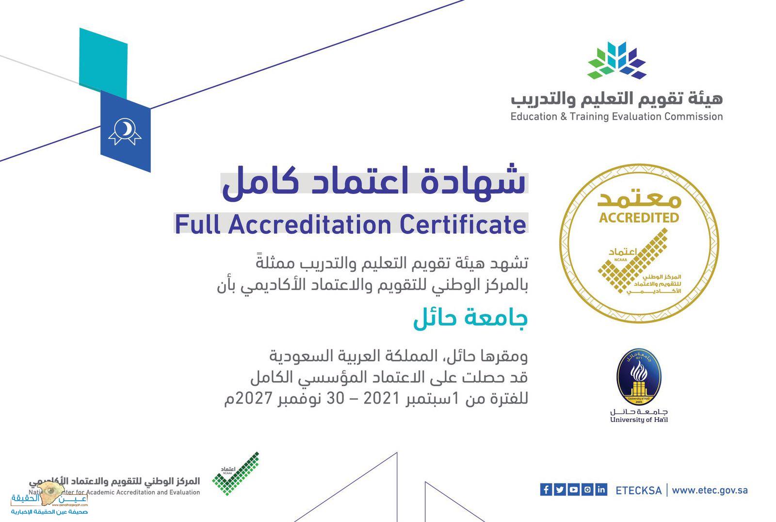 حصلت جامعة حائل على الاعتماد المؤسسي الكامل من الفترة 1 سبتمبر 2021 – 30 نوفمبر 2027 من هيئة تقويم التعليم والتدريب، ممثلة بالمركز الوطني للتقويم والاعتماد الأكاديمي.