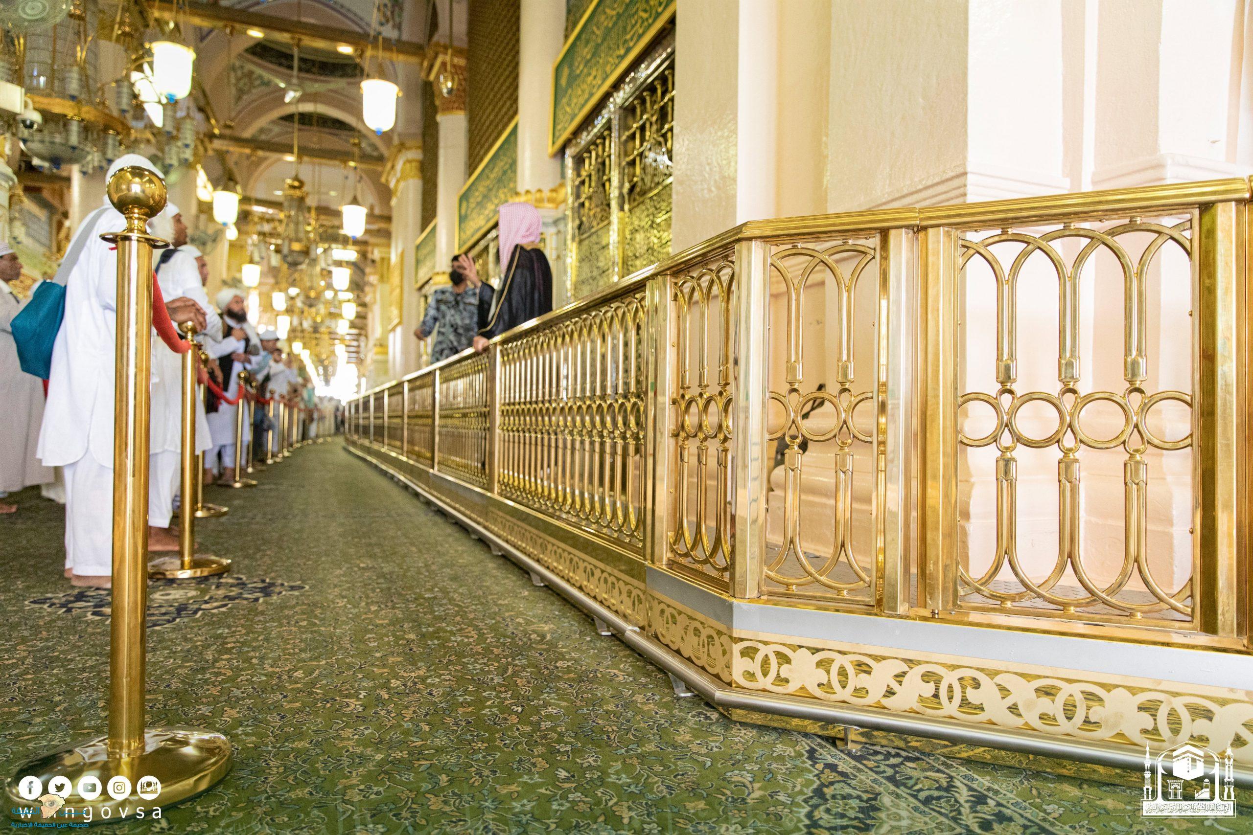 يأتي ذلك ضمن إطار المحافظة على الهوية البصرية للمسجد النبوي؛ حيث تم استبدال الحاجز الخشبي المحيط بالمقصورة الشريفة بحاجز نحاسي مذهب.