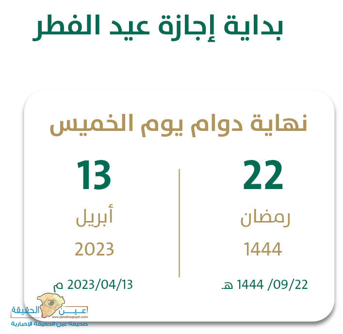 بعد مشيئة الله … بداية إجازة عيد الفطر للعام الدراسي 1444 هـ حسب تعليمات وزارة التعليم في السعودية في نهاية دوام يوم الخميس 22 رمضان 1444 هـ الموافق 13 أبريل 2023 م.