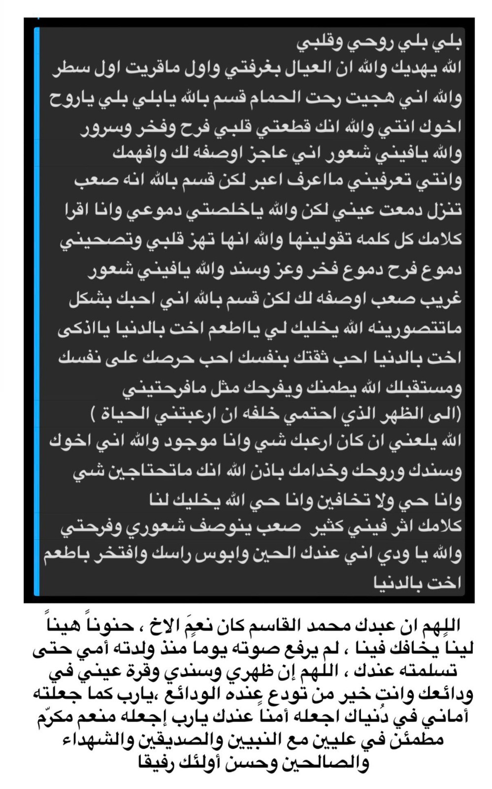 وجاء في الرسالة كلمات مليئة بالعاطفة والوفاء، حيث وصفها بأنها “أطعم وأذكى أخت بالدنيا”، وأكد أنه سيكون دائمًا سندًا لها وملاذًا آمنًا إذا واجهتها صعوبات الحياة، قائلاً: “أنا أخوك وسندك وروحك وخدامك، بإذن الله ما تحتاجين شي وأنا حي” كما عبر عن سعادته وثقته بها، متمنيًا لها التوفيق والطمأنينة في حياتها.