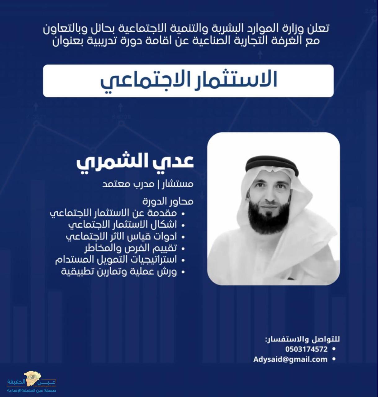 تلتقي صحيفة عين الحقيقة بسعادة المدرب المستشار/عدي بن سعيد الشمري لمشاركته في إنجاح مبادرة وطنية للتعريف بالاستثمار الاجتماعي عبر سلسلة من ورش العمل المتخصصة التي تستهدف رجال الأعمال والقطاع الخاص وقيادات الجمعيات الأهلية، والجهات المانحة، ورواد الأعمال الاجتماعيين، بهدف نشر ثقافة الاستثمار ذي الأثر الاجتماعي، وفتح آفاق جديدة لتحويل المشاريع الخيرية والتطوعية إلى نماذج استثمارية مستدامة.