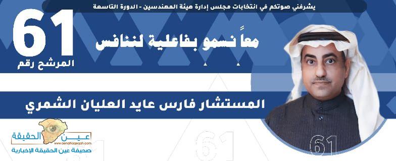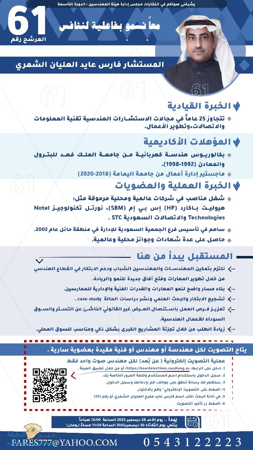 يشارك المهندس فارس عايد العليان الشمري في انتخابات مجلس إدارة الهيئة السعودية للمهندسين في دورتها التاسعة برقم ترشح (61)، وذلك في إطار توجه مهني يركز على الارتقاء بالمهنة الهندسية وتعزيز تنافسيتها، من خلال رؤية تقوم على ترسيخ النزاهة والأخلاقيات المهنية، وتفعيل ثقافة الأداء، وضمان المنافسة العادلة ضمن مسار وظيفي منظم، بما يدعم تطوير بيئة العمل الهندسي ويعزز دور المهندس الوطني، بما يتوافق مع مستهدفات رؤية المملكة 2030. ويحمل الشمري درجة البكالوريوس في الهندسة الكهربائية من جامعة الملك فهد للبترول والمعادن، ودرجة الماجستير في إدارة الأعمال من جامعة اليمامة، ويتمتع بخبرة مهنية تتجاوز 24 عامًا اكتسبها من خلال عمله في عدد من الجهات والشركات المحلية والعالمية، من بينها STC وNortel وSBM وHP. ومن المقرر أن تُجرى انتخابات مجلس إدارة الهيئة السعودية للمهندسين يوم الأحد 28 ديسمبر 2025م عبر التصويت الإلكتروني، بمشاركة المهندسين والمهندسات المسجلين رسميًا