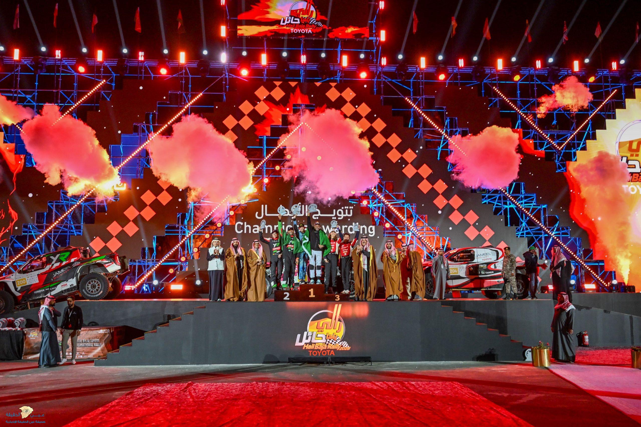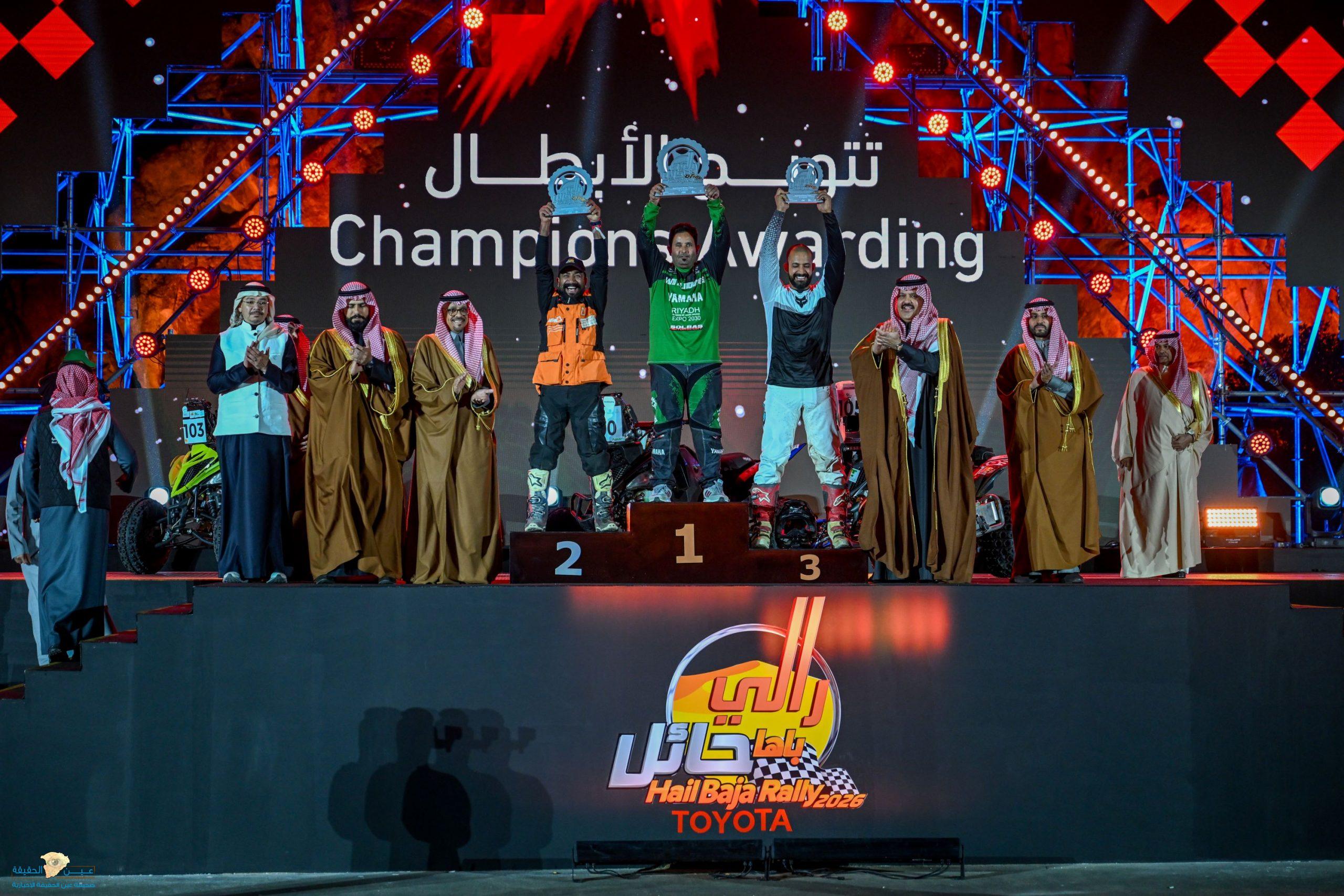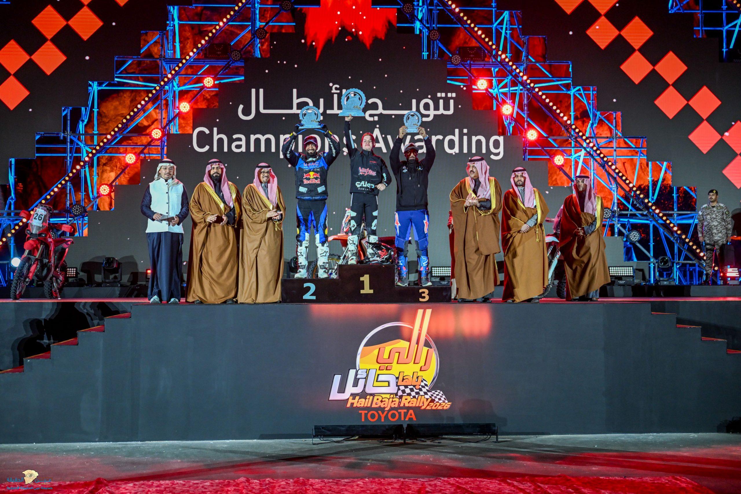 توج صاحب السمو الملكي الأمير عبدالعزيز بن سعد بن عبدالعزيز أمير منطقة حائل رئيس اللجنة العليا المنظمة لرالي باها حائل تويوتا الدولي 2026، وبحضور صاحب السمو الملكي الأمير فيصل بن فهد بن مقرن بن عبدالعزيز نائب أمير منطقة حائل، في منتزه المغواة اليوم المتسابقين أبطال رالي حائل تويوتا الدولي 2026، بعد أن حقق القطري ناصر العطية، برفقة ملاحه الفرنسي ماكس دلفينو، المركز الأول لرالي باها حائل تويوتا الدولي 2026 للمرة السادسة في تاريخ الرالي، على متن مركبة من طراز (OPTIMUS MD)، وقطع مسافة المرحلة الأخيرة البالغة 323 كم في زمن قدره 4 ساعات و 06 دقائق و 32 ثانيه، وجاء السعودي يزيد الراجحي ثانياً بفارق 42 ثانية في الترتيب النهائي، وحققت السعودية دانية عقيل المركز الثالث بفارق 14 دقيقة.