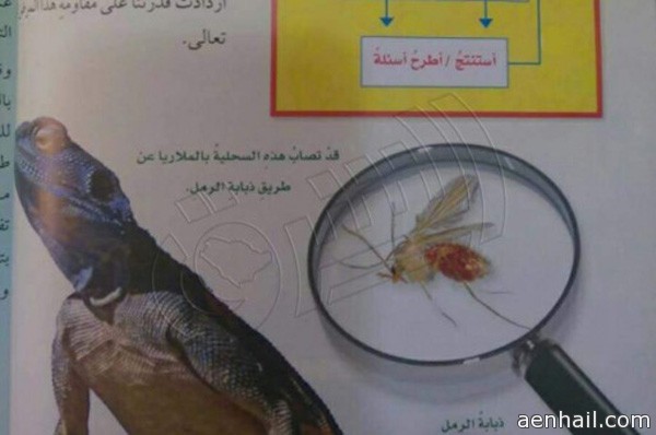 اكتشف مختصون في إدارة نواقل الأمراض «قسم الملاريا» في وزارة الصحة خطأ علميا في منهج مادة العلوم للصف الخامس الابتدائي، حيث يوجد في المنهج وبالصورة أن ذبابة الرمل تنقل مرض الملاريا وهي معلومة غير صحيحة فالتي تنقل مرض الملاريا من شخص مريض إلى آخر سليم هي «أنثى الأنوفلس» أما ذبابة الرمل فلا تنقل الملاريا وإنما تنقل «اللشمانيا» بنوعيه الجلدية والحشوية.